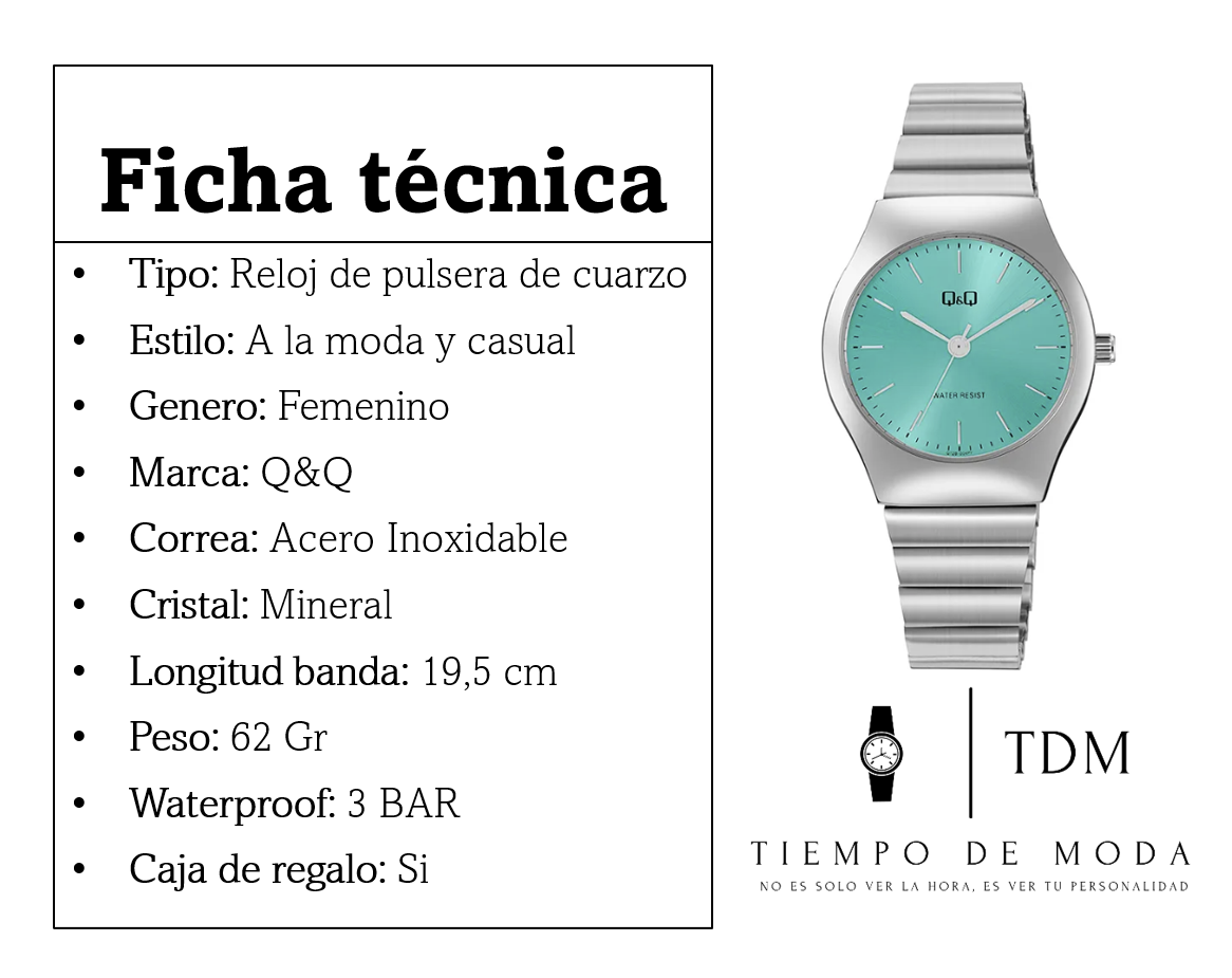 Tipo: Reloj de pulsera de cuarzo Estilo: A la moda y casual Genero: Femenino Marca: Q&Q Correa: Acero Inoxidable Cristal: Mineral Longitud banda: 19,5 cm Peso: 62 Gr Waterproof: 3 BAR Caja de regalo: Si