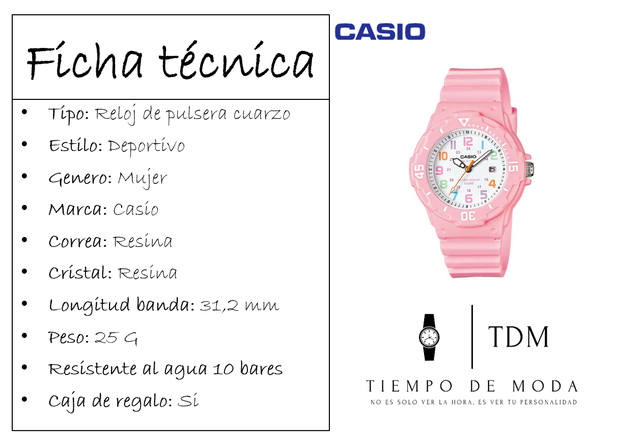 Tipo: Reloj de pulsera cuarzo Estilo: Deportivo Genero: Mujer Marca: Casio Correa: Resina Cristal: Resina Longitud banda: 31,2 mm Peso: 25 G Resistente al agua 10 bares Caja de regalo: Si