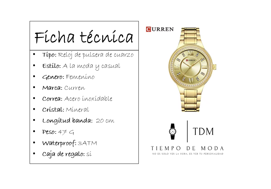 Tipo: Reloj de pulsera de cuarzo Estilo: A la moda y casual Genero: Femenino Marca: Curren Correa: Acero inoxidable Cristal: Mineral Longitud banda: 20 cm Peso: 47 G Waterproof: 3ATM Caja de regalo: si