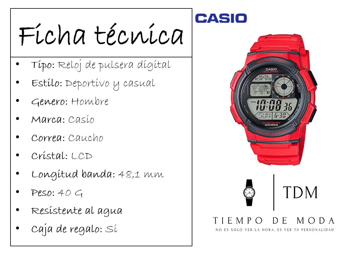 Tipo: Reloj de pulsera digital Estilo: Deportivo y casual Genero: Hombre Marca: Casio Correa: Caucho Cristal: LCD Longitud banda: 48,1 mm Peso: 40 G Resistente al agua Caja de regalo: Si