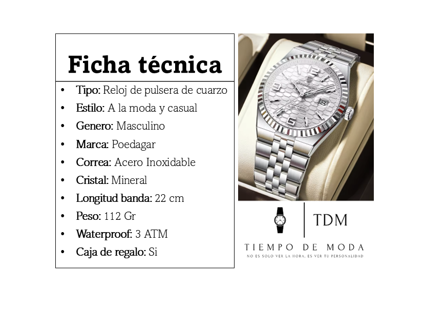 Tipo: Reloj de pulsera de cuarzo Estilo: A la moda y casual Genero: Masculino Marca: Poedagar Correa: Acero Inoxidable Cristal: Mineral Longitud banda: 22 cm Peso: 112 Gr Waterproof: 3 ATM Caja de regalo: Si [video width="3840" height="2160" mp4="https://tiempodemoda.cl/wp-content/uploads/2026/03/108.mp4"][/video]