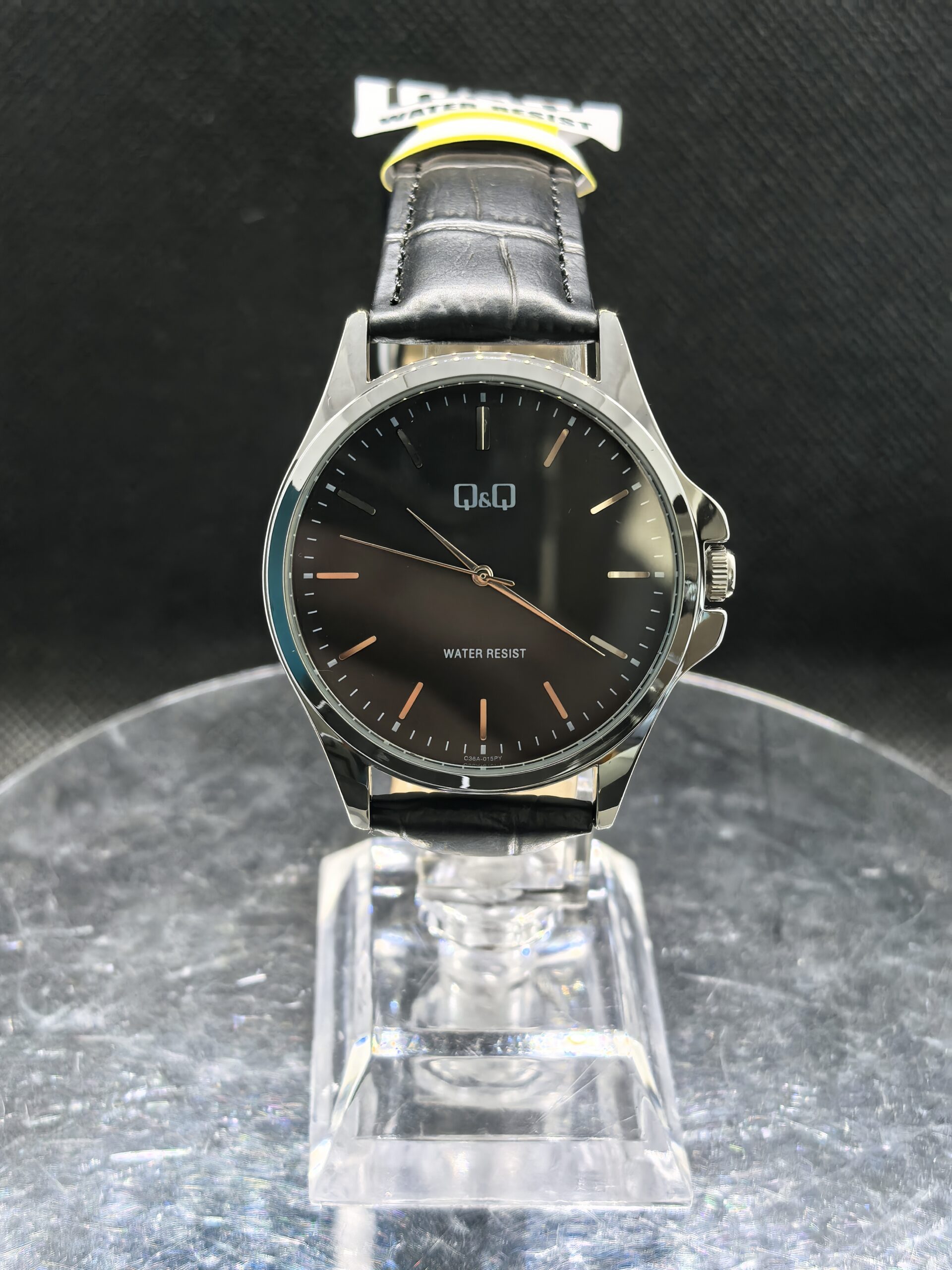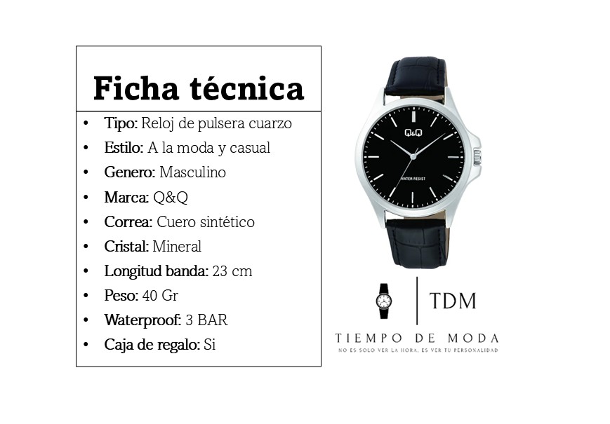 Tipo: Reloj de pulsera cuarzo Estilo: A la moda y casual Genero: Masculino Marca: Q&Q Correa: Cuero sintético Cristal: Mineral Longitud banda: 23 cm Peso: 40 Gr Waterproof: 3 BAR Caja de regalo: Si