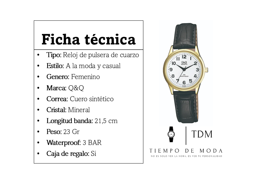 Tipo: Reloj de pulsera de cuarzo Estilo: A la moda y casual Genero: Femenino Marca: Q&Q Correa: Cuero sintético Cristal: Mineral Longitud banda: 21,5 cm Peso: 23 Gr Waterproof: 3 BAR Caja de regalo: Si