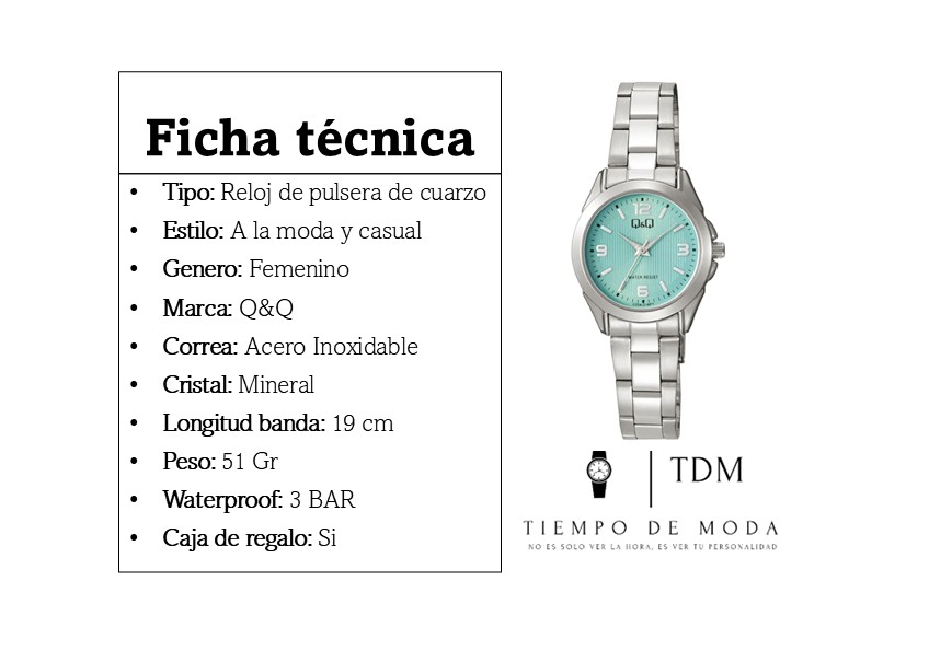 Marca: Q&Q Correa: Acero Inoxidable Cristal: Mineral Longitud banda: 19 cm Peso: 51 Gr Waterproof: 3 BAR Caja de regalo: Si