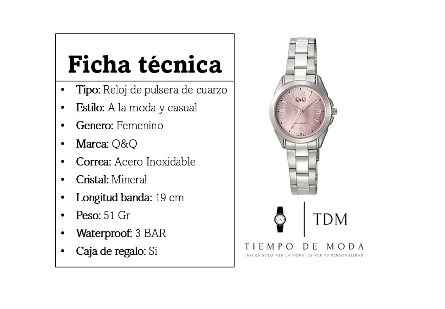 Tipo: Reloj de pulsera de cuarzo Estilo: A la moda y casual Genero: Femenino Marca: Q&Q Correa: Acero Inoxidable Cristal: Mineral Longitud banda: 19 cm Peso: 51 Gr Waterproof: 3 BAR Caja de regalo: Si