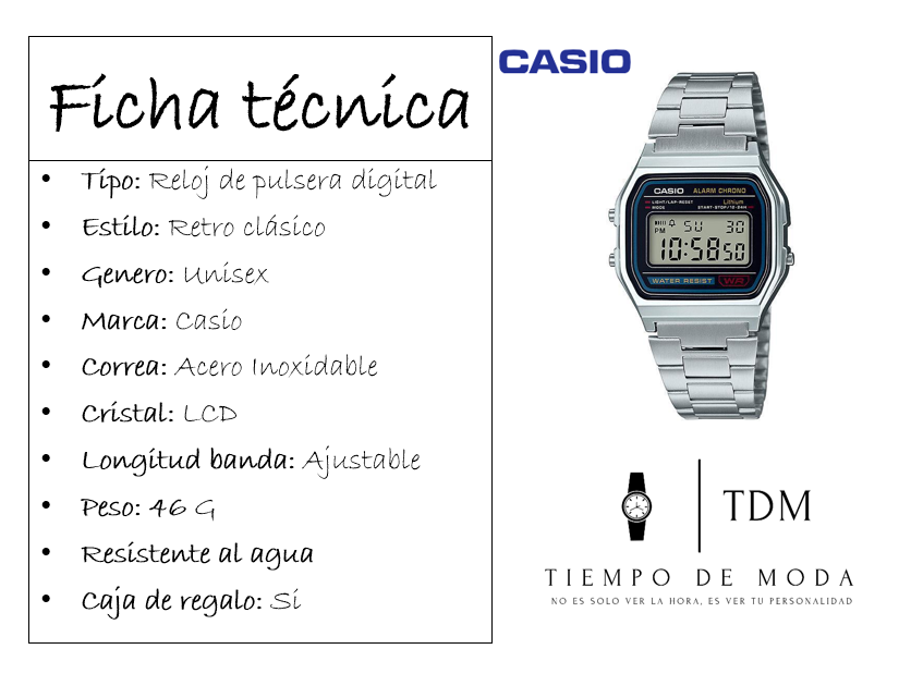 Tipo: Reloj de pulsera digital Estilo: Retro clásico Genero: Unisex Marca: Casio Correa: Acero Inoxidable Cristal: LCD Longitud banda: Ajustable Peso: 46 G Resistente al agua Caja de regalo: Si